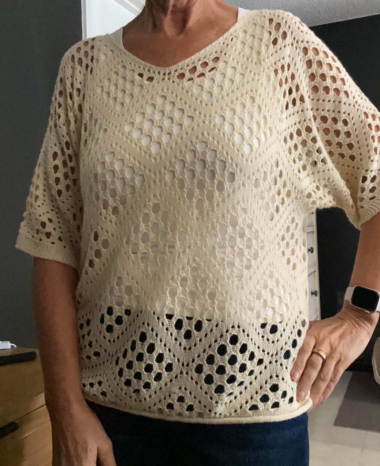 “I love this crochet pattern so much! The beige is incredibly soft. I wore it with a brown belt and wide‑leg pants – all my friends asked where I got it.”