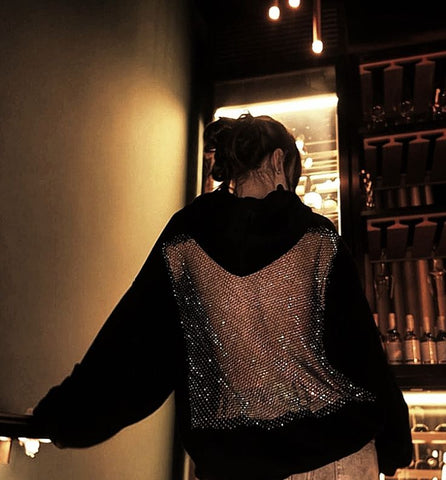 Comfort in the front. Show-stopper in the back. When the lights hit, this hoodie turns heads, cameras, and the whole room. It’s the “I just walked in” energy—soft fleece feel, framed by a shimmering crystal-mesh back that catches every flash and dance-floor beam.